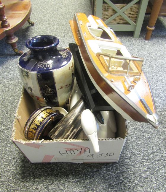 Mixed lot including a large Japanese vase, a model boat, two cow horns, other ceramics, books, etc