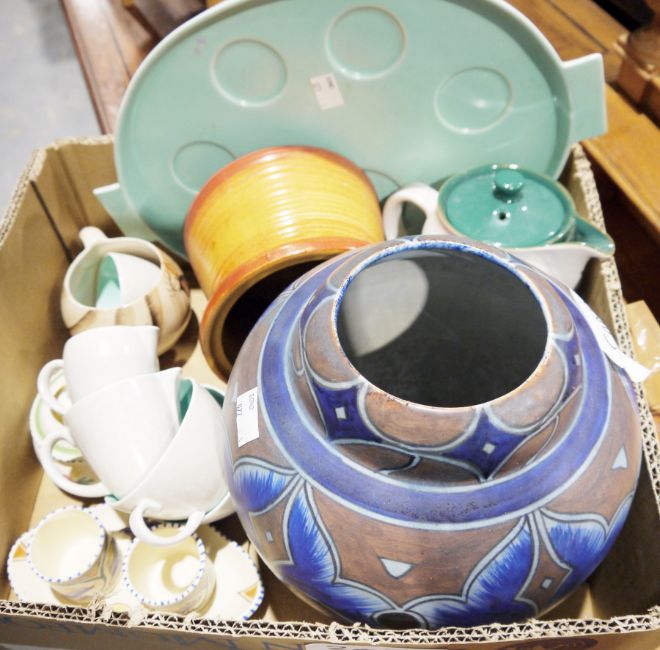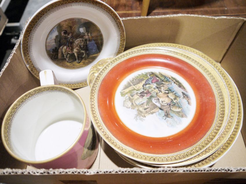 Willow pattern blue and white part tea service, Royal Worcester 'Evesham' ramekins, assorted Poole items, a large Chameleon ware hand painted vaseassorted cabinet plates, a Prattware tankard (3 boxes)