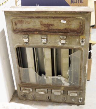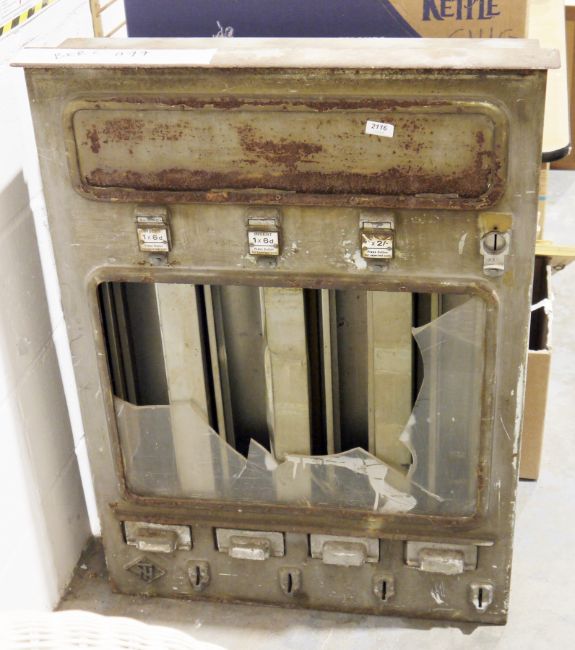 Vintage metal vending machine with four dispensers, the bottom left hand corner of the case with embossed initials 'TN' within a lozenge (in poor condition with glass screen broken), 94cm high
