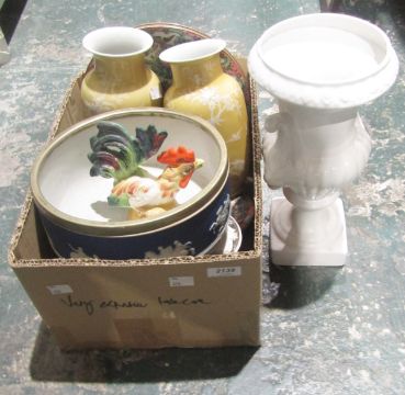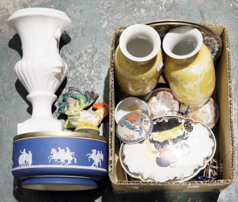 Collection of ceramics including a mid-century Italian cockerel, a 19th century Wedgwood jasperware bowl, some Chinese famille rose plates, Chinese-style trinket boxes, etc
