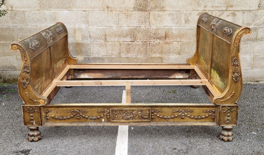 French empire style double sleigh bed, the gilt finish decorated with neo-classical figures, floral swags and anthemion, raised on large paw feet, 115cm high x 220cm long x 142cm wide Property of Dunkirk Manor, Theescombe, Stroud