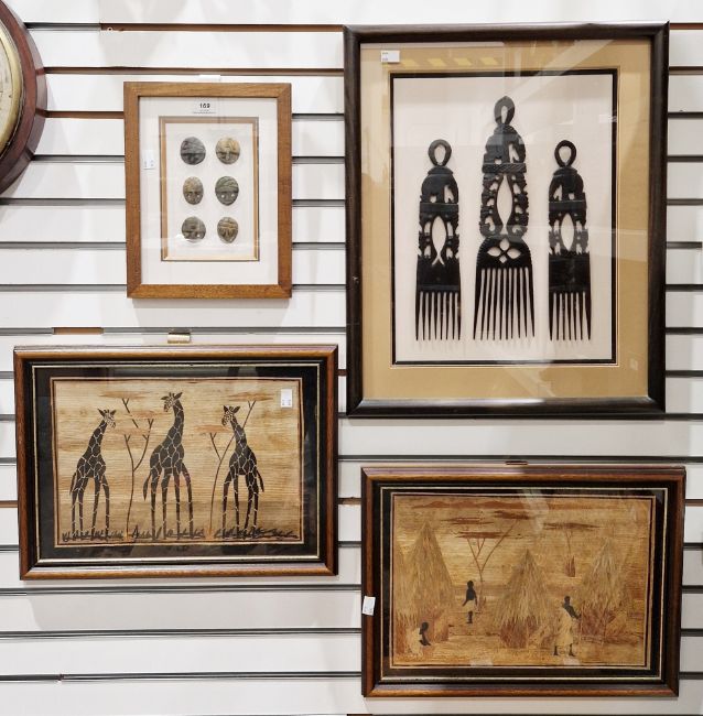Set of three African Ashanti wooden carved combs, largest 35cm high, mounted, framed and glazed as a set and a framed and glazed set of six stone ethnic miniature face masks, largest 4cm high plus two framed and glazed African pictures made from bark and wood depicting giraffes, figures in a tribal village