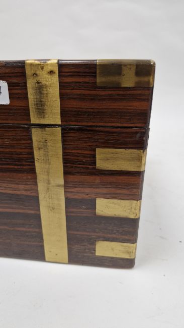 Surface scratches and scuffs, interior compartments missing lids. One clasp thats hold slope in place missing on lid, Areas of loss to wood on slope, slope detaches, Split to wood of folding slope and base of box. Areas of loss to wood near hinges. Tarnishing , scratches and minor dents to brass. General wear and tear.