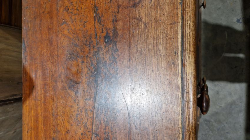 Surface scratches, scuffs and knocks. Areas of fading/discolouration, staining and accretions. Splits to the top, sides and front of 3 drawers. Moulding from base of left side is missing. Handles don't look original. General wear and tear.