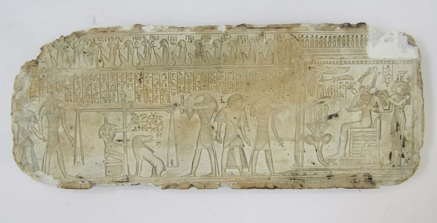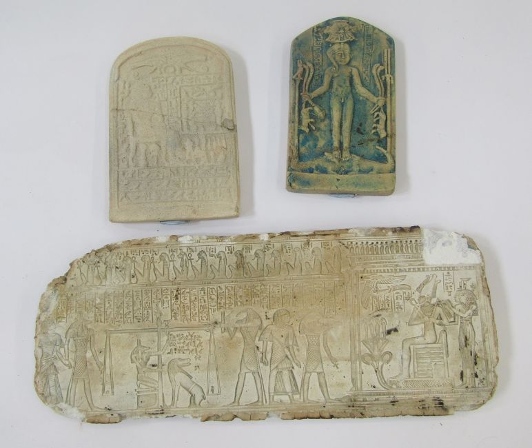 Collection of Grand Tour and later Egyptian artefacts, plaster and pottery stela fragments including 2 wooden shabti.