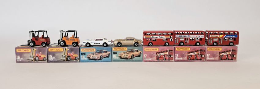 Seven boxed Matchbox Superfast 75 series diecast model cars to include No.15 Fork Lift Truck (orange, Hi-Lift), No.15 Fork Lift Truck (red, Hi-Lift), No.16 Pontiac (green body), No.16 Pontiac (white body, firebird), No.17 The Londoner (Berger Paints), No.17 The Londoner (Laker) and No.17 The Londoner (Matchbox London Bus) (7)