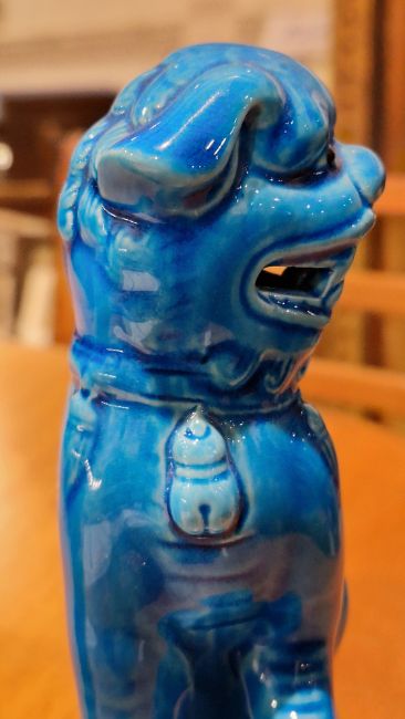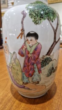 Chinese porcelain rouleau vase painted in enamels with old figure and attendant in landscape, inscription to reverse, four-character seal mark to base, probably 20th century, 25cm high, a Chinese porcelain cooking pot with peach, prunus and lotus decoration, four-character mark to base (lid missing), 12cm high, a pair of blue glazed Buddhist lions on plinth bases, 21cm high, a Canton porcelain circular plate, a porcelain teacup and saucer painted with immortals, six-character mark to base and a small pierced modern Chinese dish (7)  Property of Dunkirk Manor, Theescombe, Stroud Condition Report Vase in good order. Some light surface marks and accretions. General wear and tear.Lions - tiny chip to corner of one base.Cooking pot - Chips to rim, missing lid, wear to gilding and decoration.Plate - Surface marks and wear to decorationImmortals cup & saucer - Surface scratches and wear to gilding and decoration.