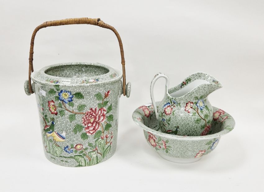 Copeland pottery part wash-set, late 19th century, printed green Late Spode marks, impressed marks, printed with chinoiserie flower-sprays on a leafy green ground, comprising: a ewer and basin, a cylindrical slop-pail and liner, with wicker handle Property of Dunkirk Manor, Theescombe, Stroud