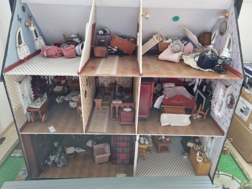 Kit built dolls house with slate effect roof and wooden panel effect walls, the front panel lifting out to eight rooms filled with various wooden effect furniture and accessories including ceramics, clothing and food plus two china dolls