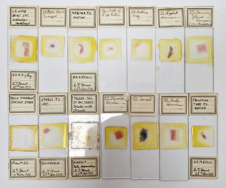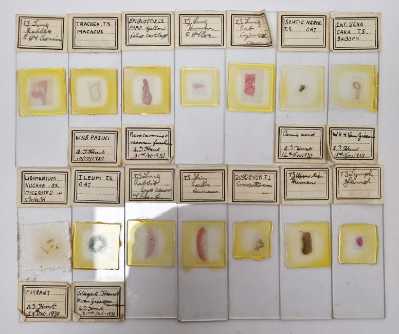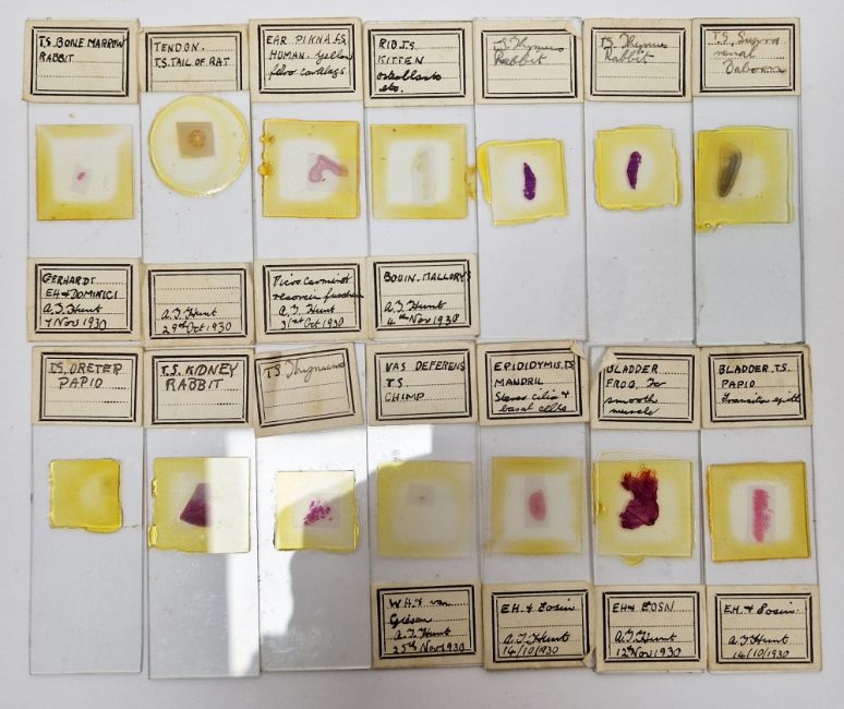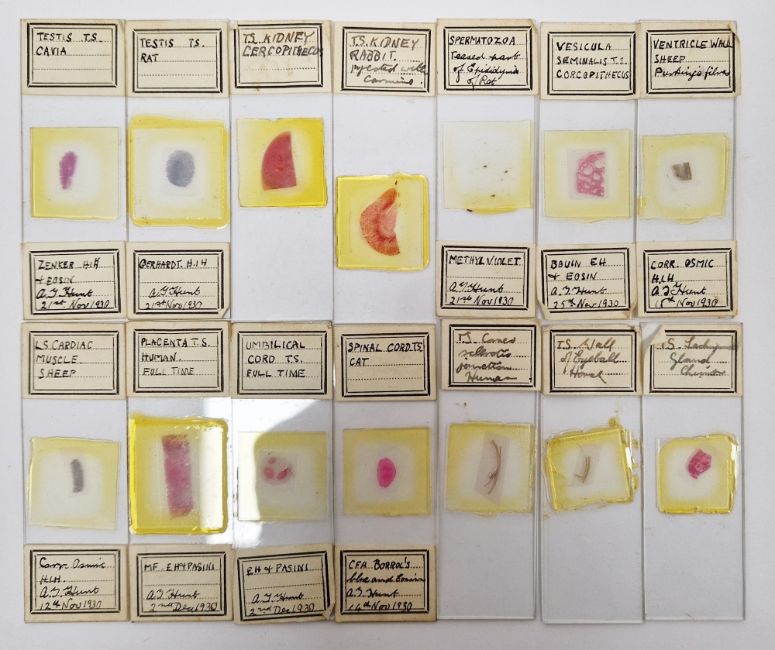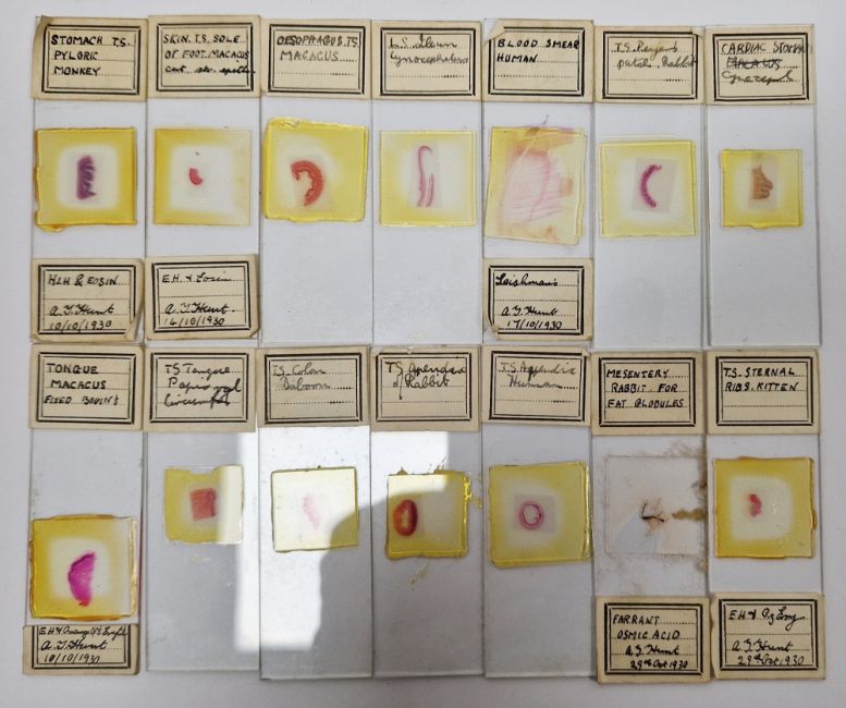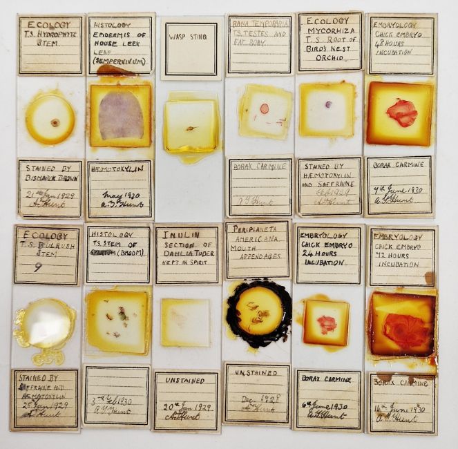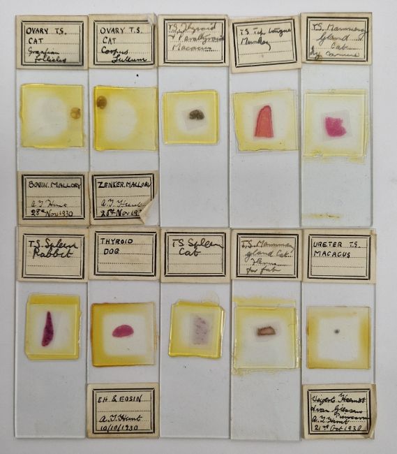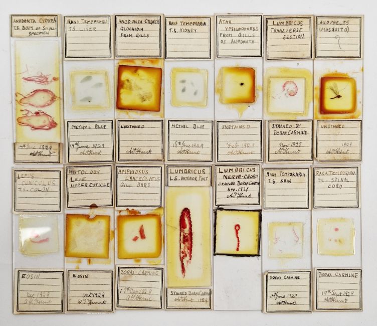Slides are mainly mammalian to include monkey, cat, rabbit etc. Some amphibian such as frogs and newts. Some insect and botanical, some pathology and histology slides as well. See photos.