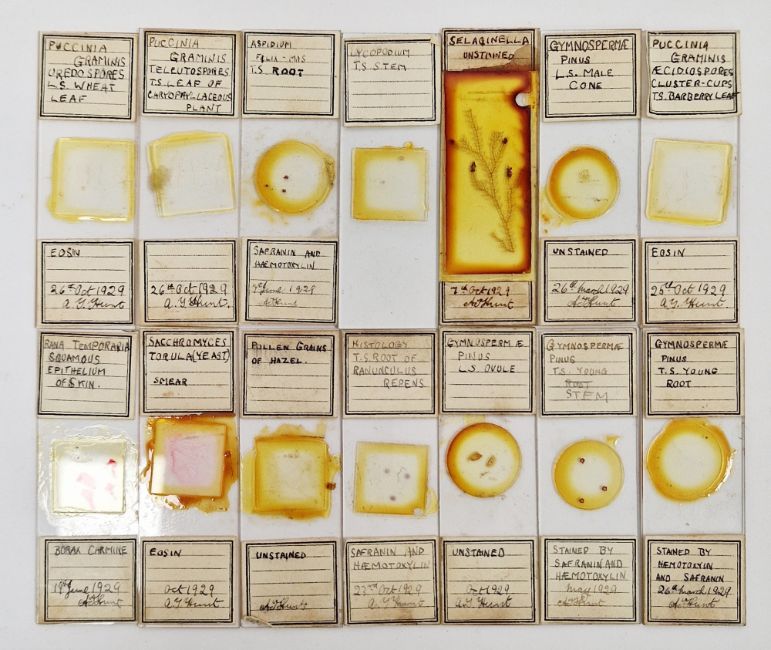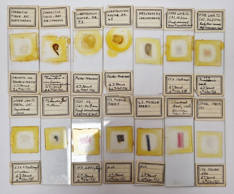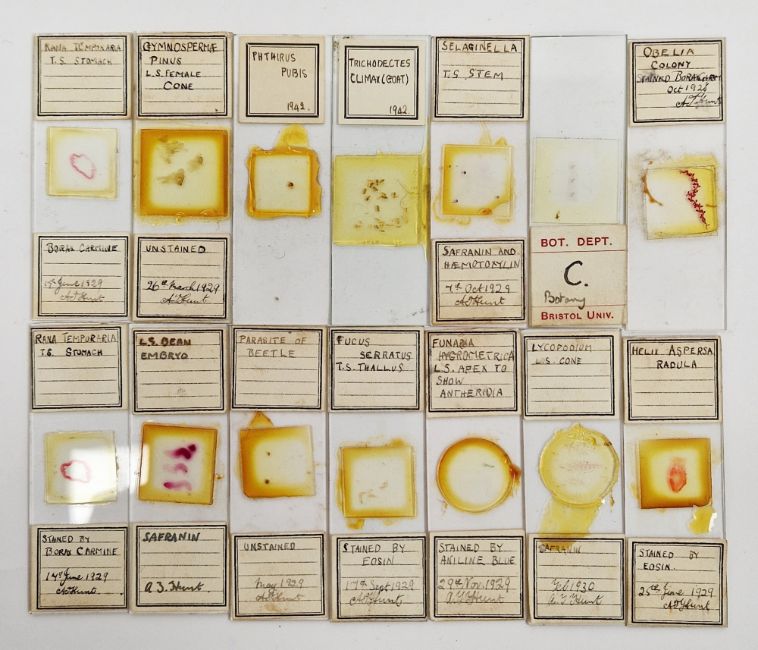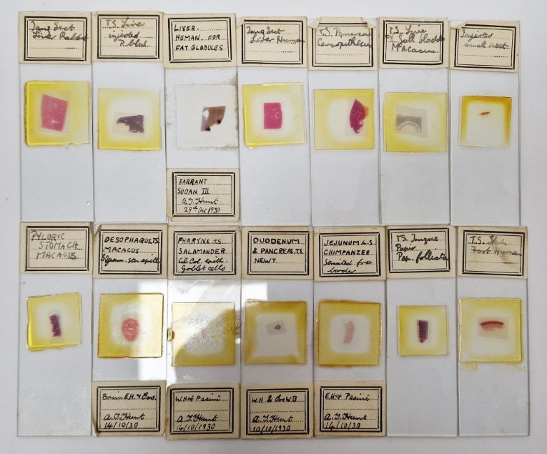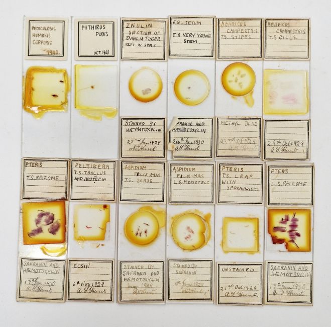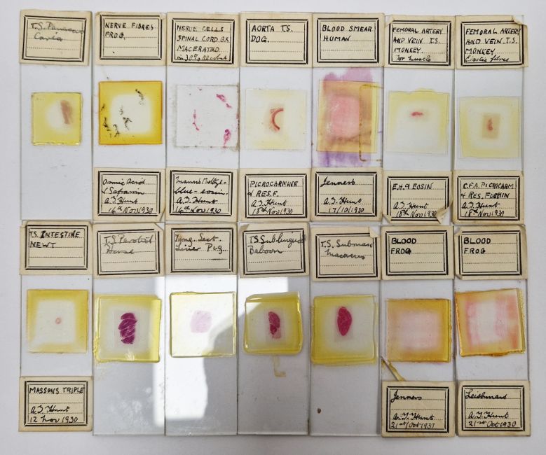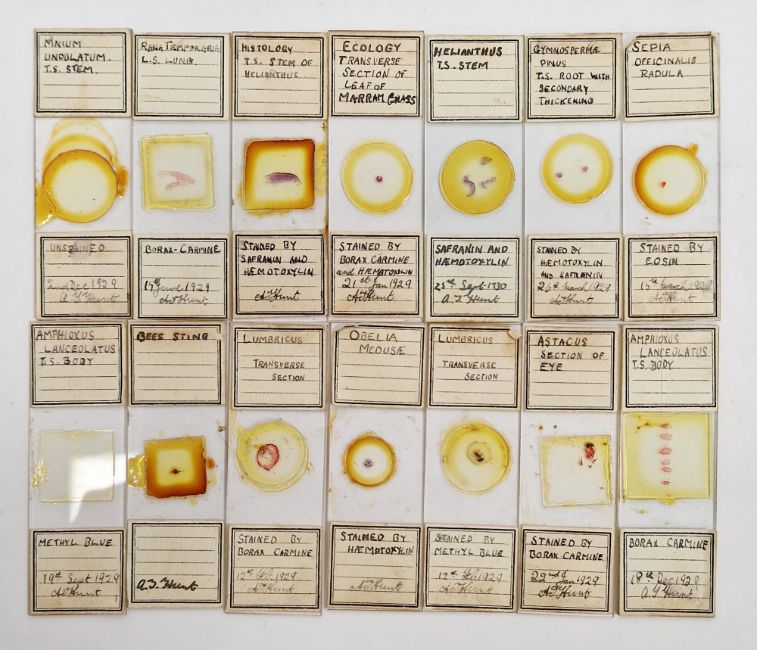 Slides are mainly mammalian to include monkey, cat, rabbit etc. Some amphibian such as frogs and newts. Some insect and botanical, some pathology and histology slides as well. See photos.