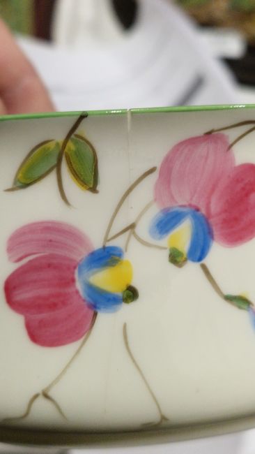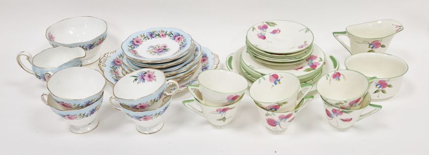 Royal Doulton Art Deco part tea-service, printed green marks, pattern no. V.1409, with pink and blue flowers within green lined rims, comprising: six teacups, saucers, side-plates, a cake-plate, an oval sugar-bowl and a milk-jug, together with a Foley bone china Cornflower pattern part tea-service, comprising: milk-jug, a sugar-bowl, four teacups, five saucers, six side-plates and a cake plate Condition Report Doulton - sugar bowl with chip to rim and hairline crack. One teacup with hairline crack and chip to foot.Foley - Creamer with chip to rim.All pieces with surface marks, accretions and general wear and tear.