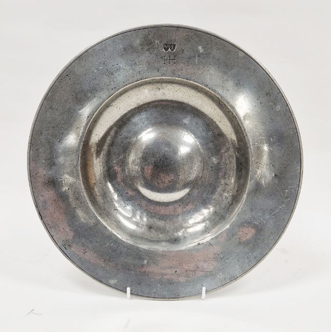 German pewter broad rim plate, circa 1680, with bossed bottom, hallmarked to rim, above incised ownership conjoined initials HH, 28cm diam.