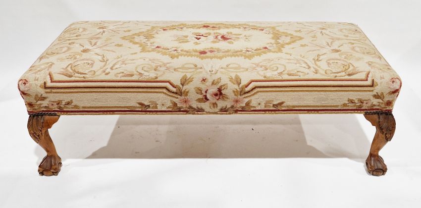 Early 20th century stool with floral needlework upholstered seat and raised on short carved cabriole legs with ball and claw feet, 40cm high x 133cm long x 65cm wide  Property of Dunkirk Manor, Theescombe, Stroud Condition Report Overall in good order. Some slight fading to upholstery overall, light wear, otherwise in good order. some very minor scuffing to edge of feet.