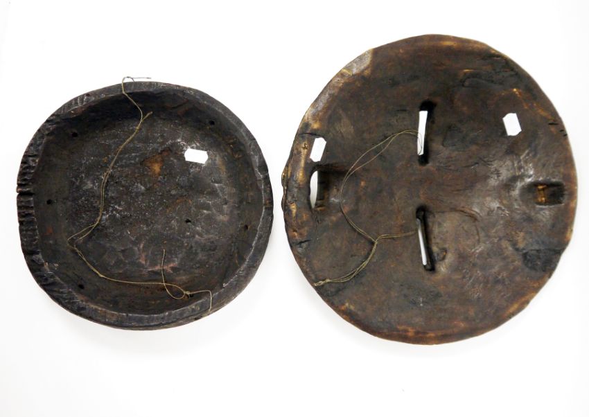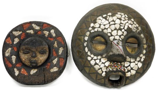 Tribal shield wooden face mask with shell and bead inlay, possibly Congo Baluba, 31cm diameter together with an Eket sun mask carved as a face, 23cm diameter