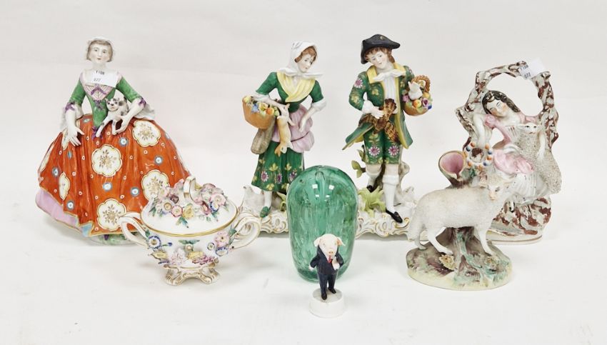 Continental porcelain figure of lady in crinoline dress holding dog, gold anchor mark, pair continental porcelain figures of lady and gallant, with gold anchor mark, Staffordshire pottery flatback figure, two animal modelsa glass dump paperweight and floral encrusted covered sugar bowl (8)