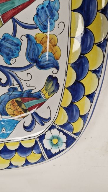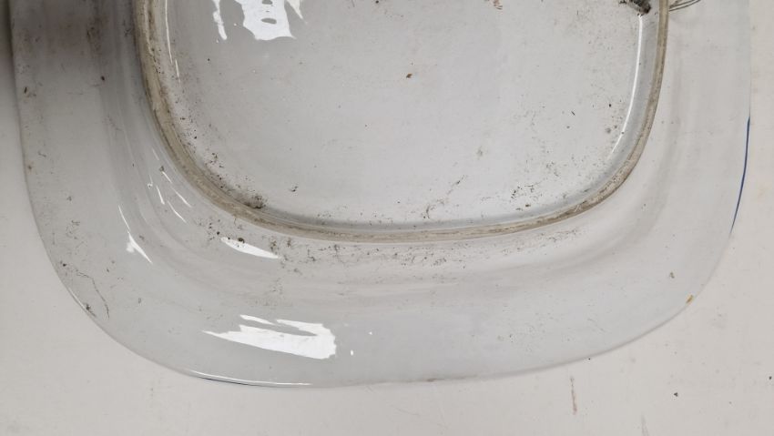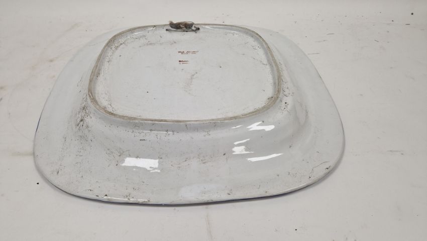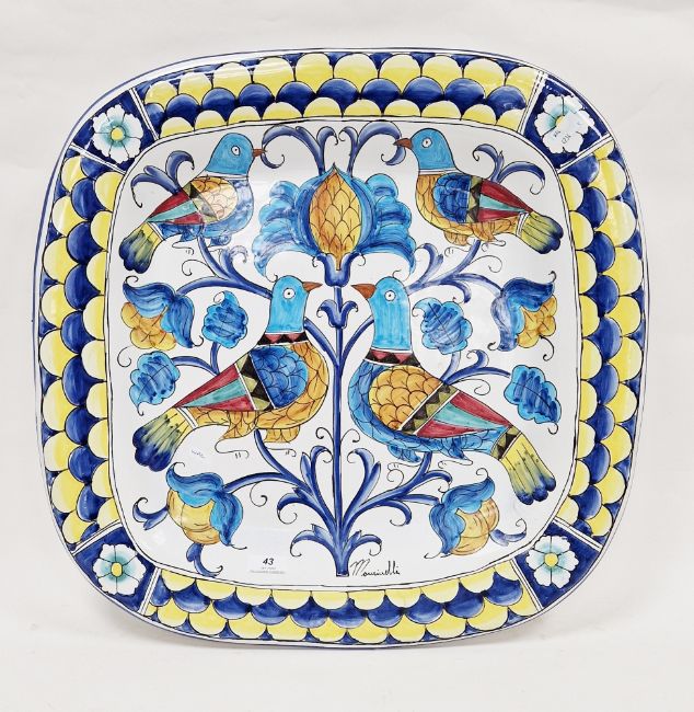 Italian pottery large charger, rounded square and decorated in bright polychrome colours with stylised birds and floral branches to the centre, 55cm square  Property of Dunkirk Manor, Theescombe, Stroud Condition Report Good overall condition. Light surface marks and accretions. General wear and tear