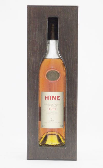 Bottle of Hine 1953 Grand Champagne Cognac, label carries a Royal Warrant by Appointment of Her Majesty Queen Elizabeth II, housed in original wooden box with information leaflet, 70cl, 40% vol