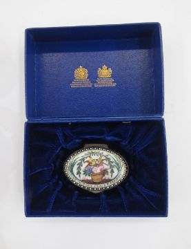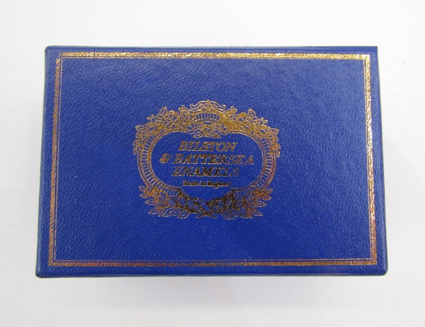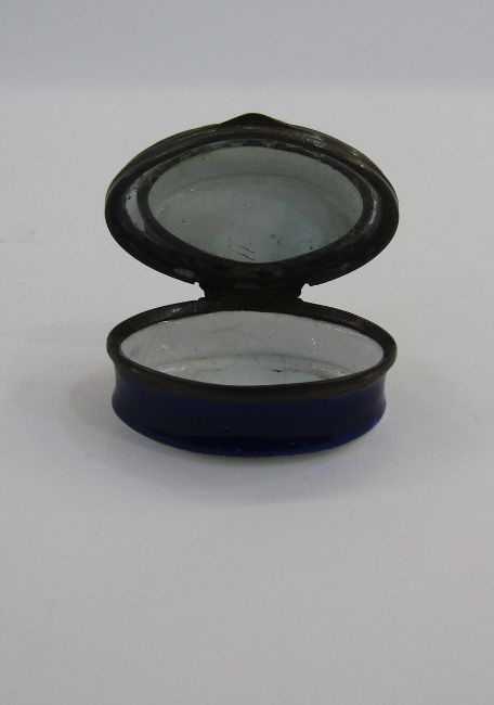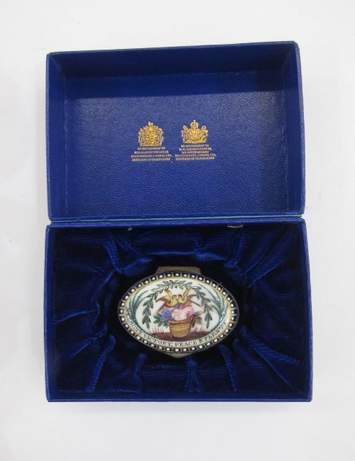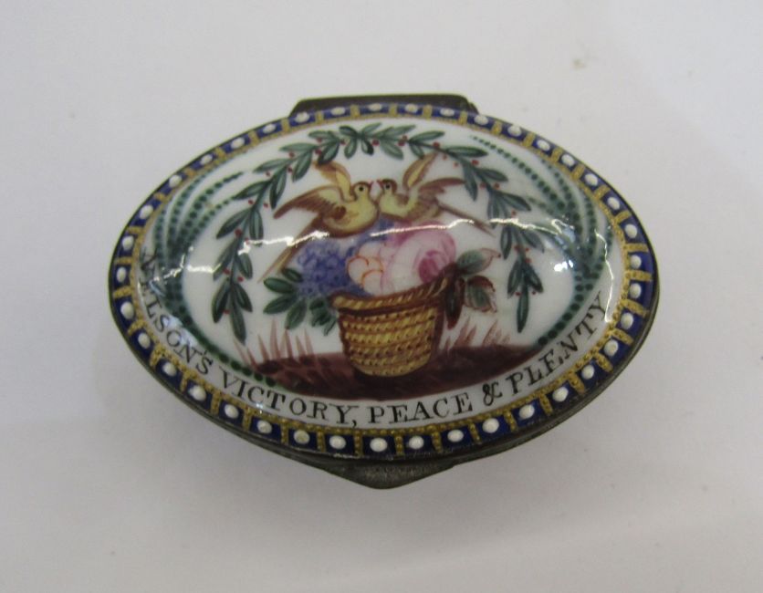Early 19th century Bilston enamel oval patchbox, the cover decorated with a basket of flowers and birds within an arch of leaves and the motto 'Nelson's Victory Peace and Plenty', within a raised enamel and gilt border, 5cm long, and an antique treen love spoon, with deep oval bowl and the handle carved with a pierced finial and shield, 23.5cm long (2)
