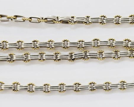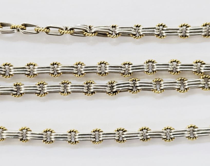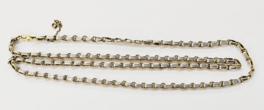 Italian bi-colour gold necklace formed of alternating yellow gold rope twist links and white gold three bar links, marked 750, 82cm long, approx 64.4g