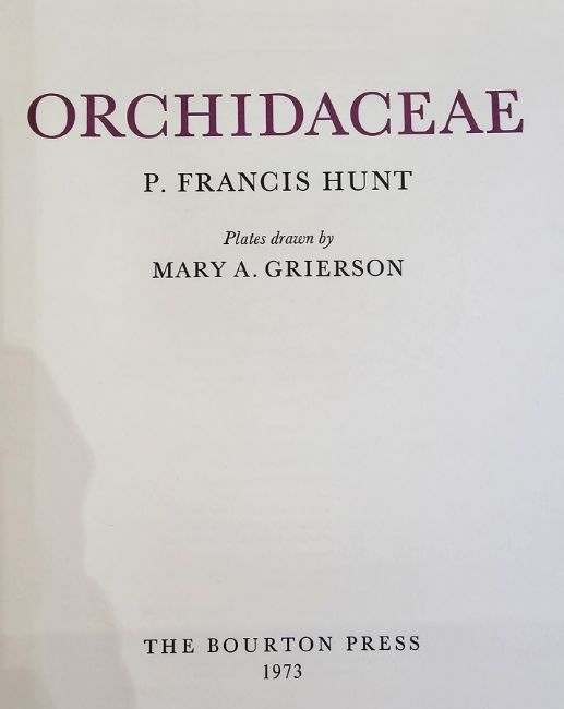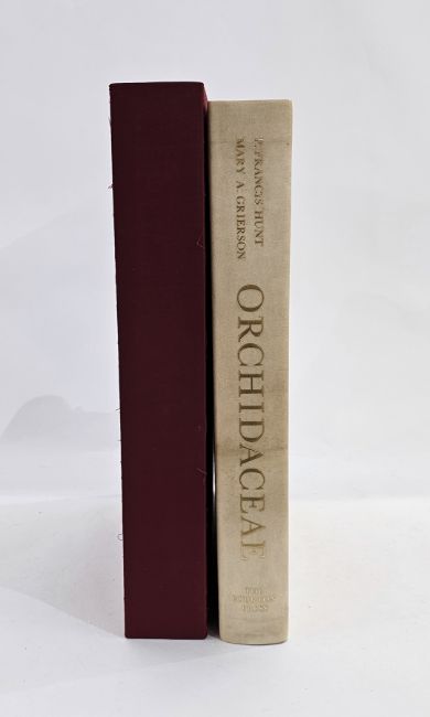 Hunt, P Francis "Orchida Ceae", plates drawn by Mary A Grierson, the Bawton Press 1973, no.180/1260 for public sale, this copy is subscribed by Henry Sotheran Limited, signed by author and artist, full colour plates, full natural calf vellum, elephant folio, with gilt titles,  slip case  with a soft flocked paper interior to preserve the vellum