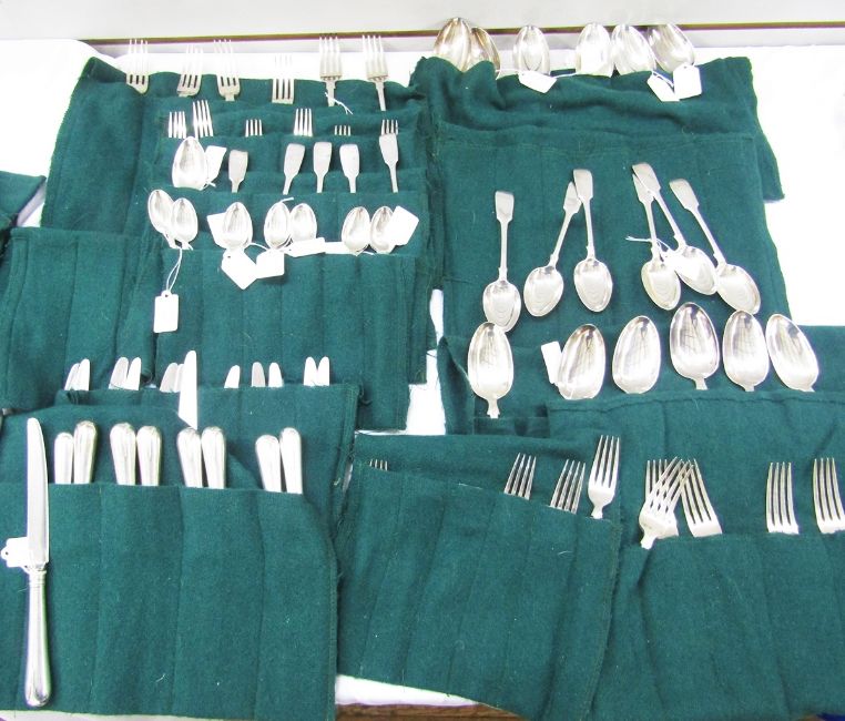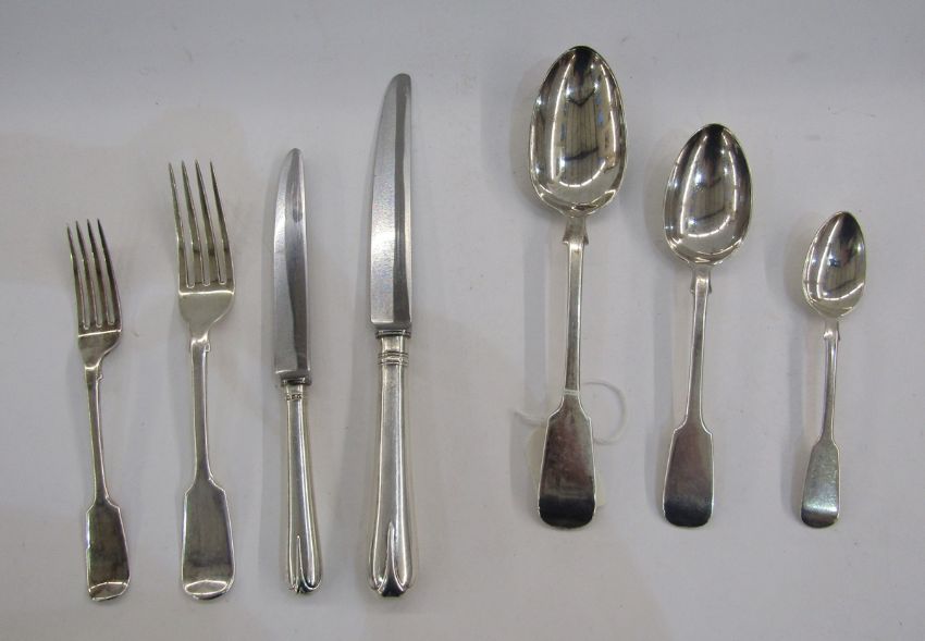 Matched silver service of table flatware, fiddle pattern, for 12 persons, various dates and makers to include six table forks, London 1913, 14.5ozt; six William IV and Victorian table forks, 14ozt; 12 tablespoons, London 1871, 28ozt; six dessert spoons, London 1899, 9.5ozt; six dessert spoons, London 1858, 9ozt; 12 dessert forks, variously London 1913 and Sheffield 1911, 19.5ozt; 12 silver teaspoons, London 1883 and other dates, 9ozt; 12 silver-handled table knives, London 1964, and 12 silver-handled dessert knives