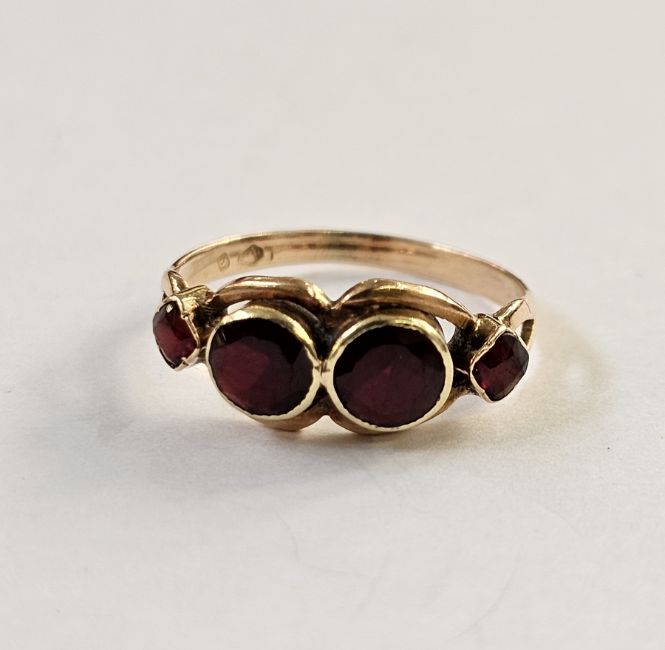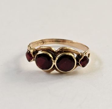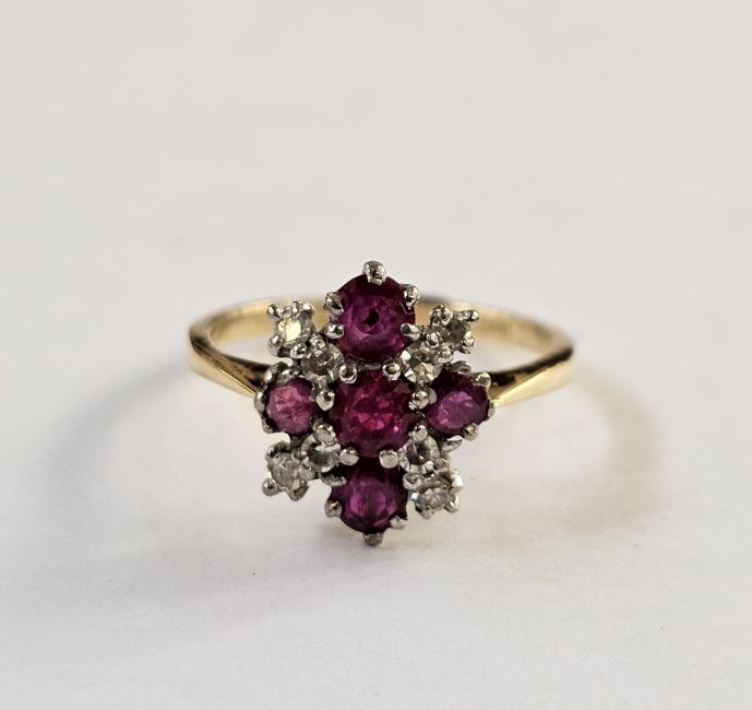 Gold, ruby and diamond ring, the five rubies arranged in a cross design interspersed with eight cut diamonds, marked 18ct, finger size P, and another gold four-stone garnet ring (2)