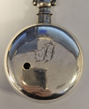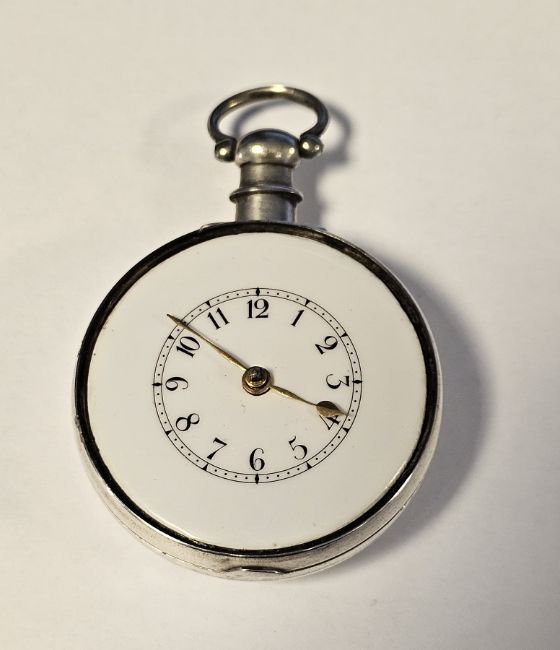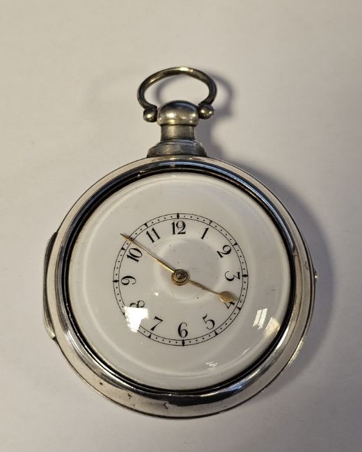 George III silver pair cased single fusee open faced pocket watch, the enamel dial with Arabic numerals denoting hours, outer and inner silver cases hallmarked London 1812, movement indistinctly marked P Brownswold Derby, no 4880 (glass loose)