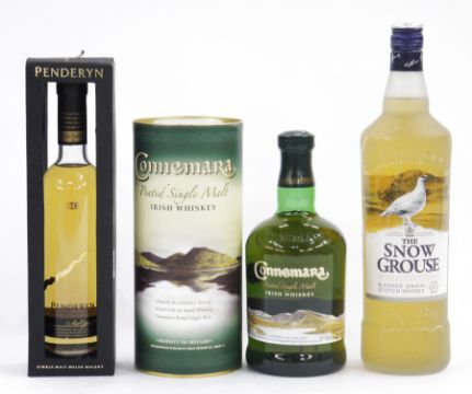 Connemara peated single malt Irish whiskey, 40% vol 70cl, in original box, together with Penderyn single malt Welsh Aur Cymru whisky, 35cl 46% vol, in original box, and a bottle of the Snow Grouse smooth chill filtered blended grain scotch whisky, 40% vol 1L (3)