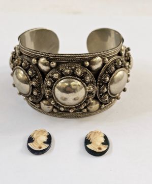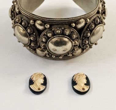 Thai white metal bangle with wirework decoration, marked Siam Sterling, and two cameos of ladies (3)