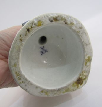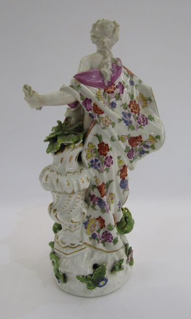 Some chipping to her right fingers, to her scythe, the corn and her wreath, to the applied leaves, small retouched flake to the melon at base and further small flake, the applied flowers chipped and with old areas of retouching to applied leaves at base. Very minor faint firing crack through her left foot, very minor wear to enamels and gilding.