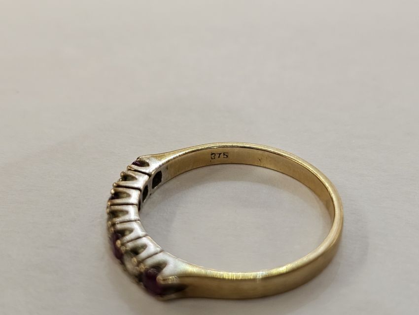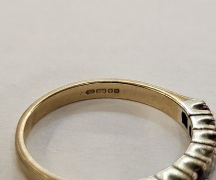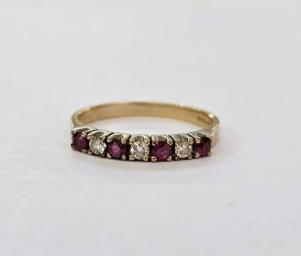 9ct gold seven-stone diamond and ruby ring with alternating brilliant cut diamonds and circular mix cut rubies in claw setting, finger size L, 1.7g approx.