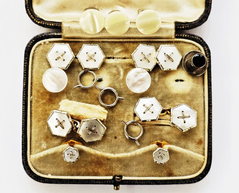 Pair of gold and mother of pearl cufflinks of hexagonal design with central wire decoration, marked 9ct, with a pair of matching collar studs and full matching buttons in fitted case (incomplete), and with other studs etc