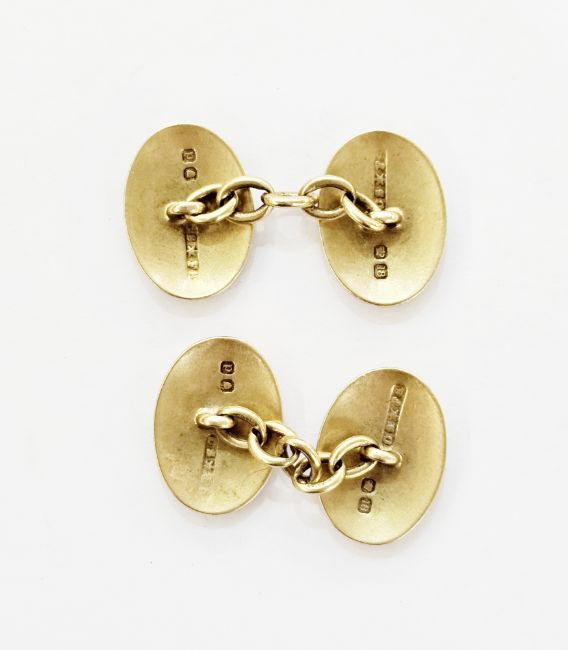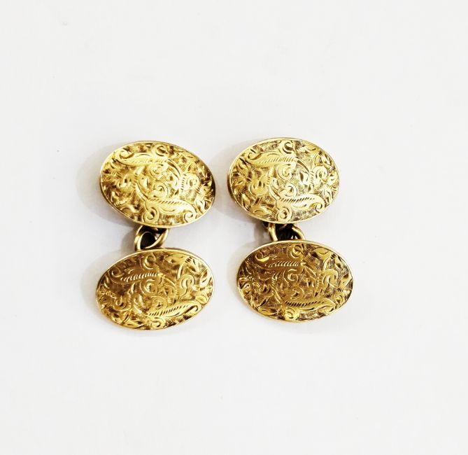 Pair of 18ct gold cufflinks by Saunders and Shepherd, London 1899, of oval form with engraved foliate decoration and chain links, approx 10.4g