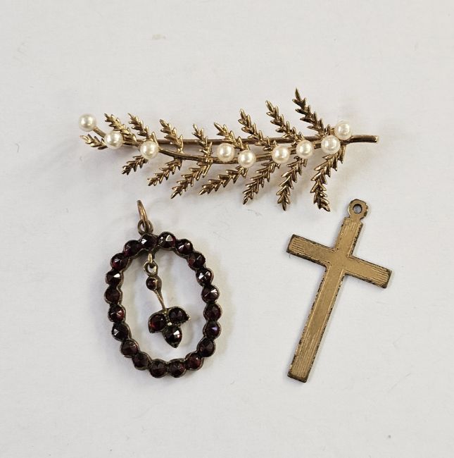 9ct gold spray brooch set with eight small cultured pearls, 3.8g approx., a Bohemian garnet pendant and a rolled gold cross (3)