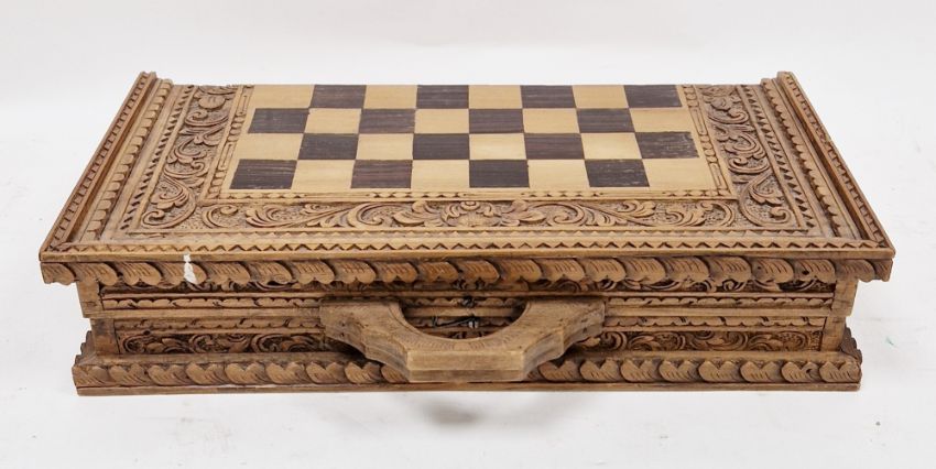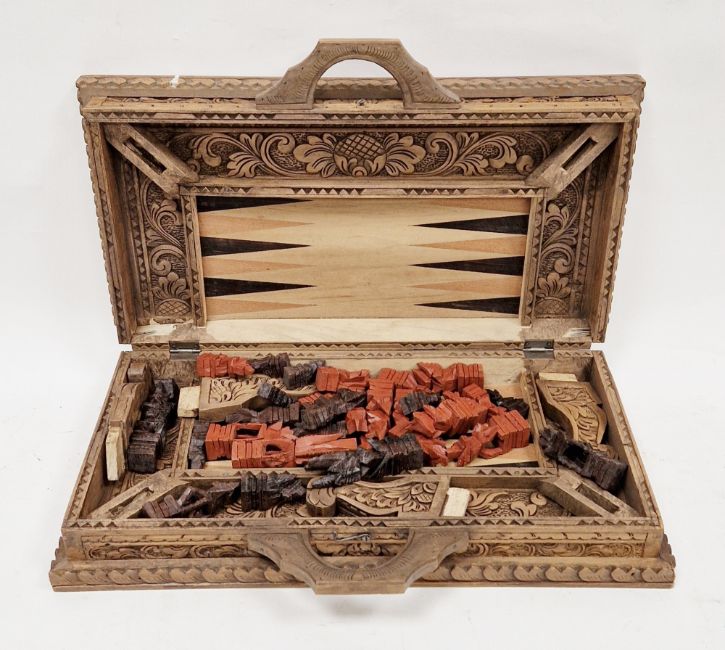 20th century Balinese carved wood chess set, the folding board carved with dense foliage, with carry handles, 42.5cm square