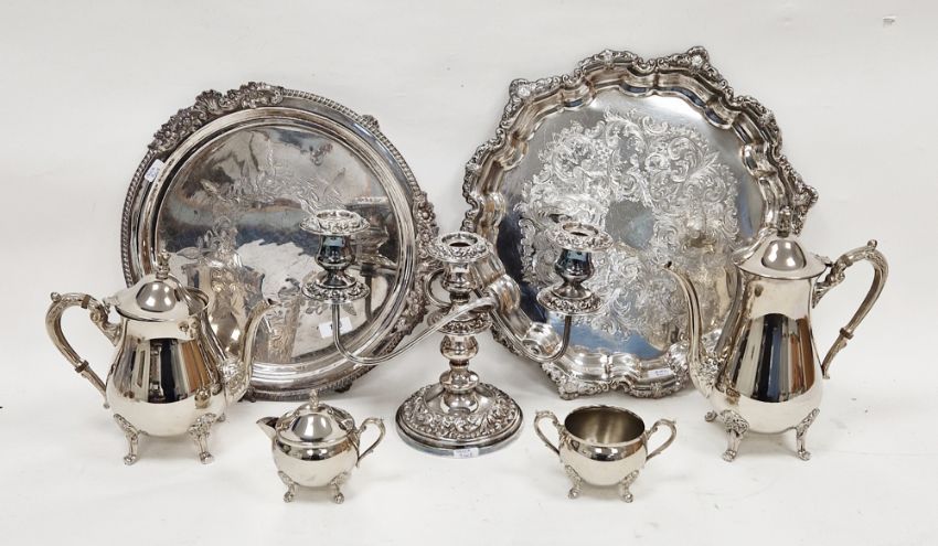 Late 19th/early 20th century silver plated salver of circular form with embossed foliate decoration, on three lion's paw feet, another silver plated salver, a three-branch candelabrum and a four-piece silver plated teaset