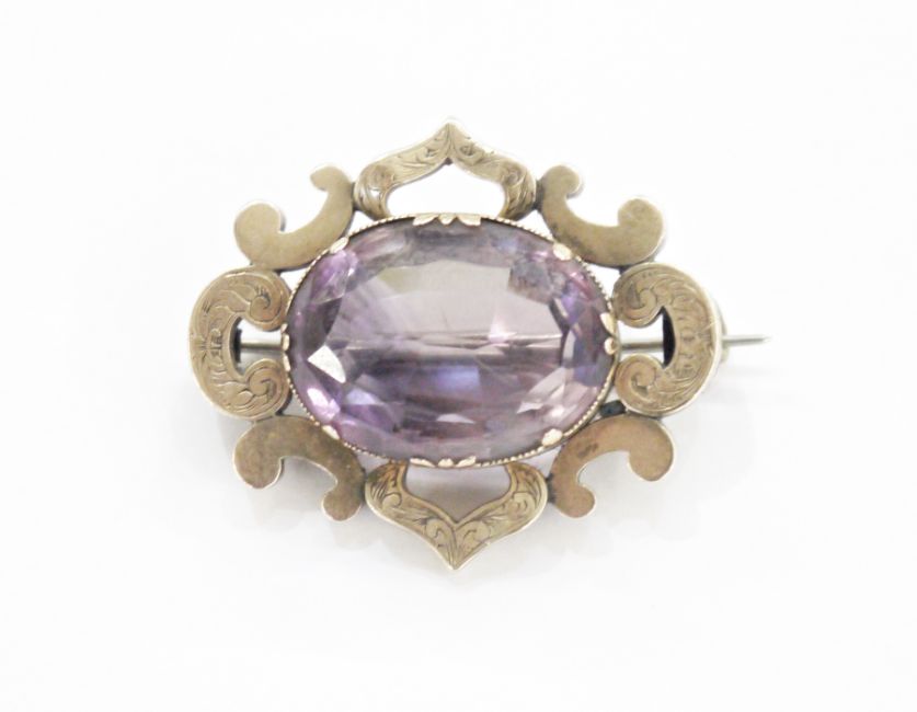 Victorian gold-coloured metal and purple stone brooch, the oval amethyst-coloured stone within C-scroll border