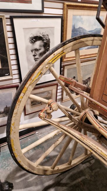 Painted wooden horse gig or carriage, full size with two spoke wheels and twin shafts for a single horse or pony, approximately 145cm high x 324cm long x 160cm wide (please allow a few days notice for collection)