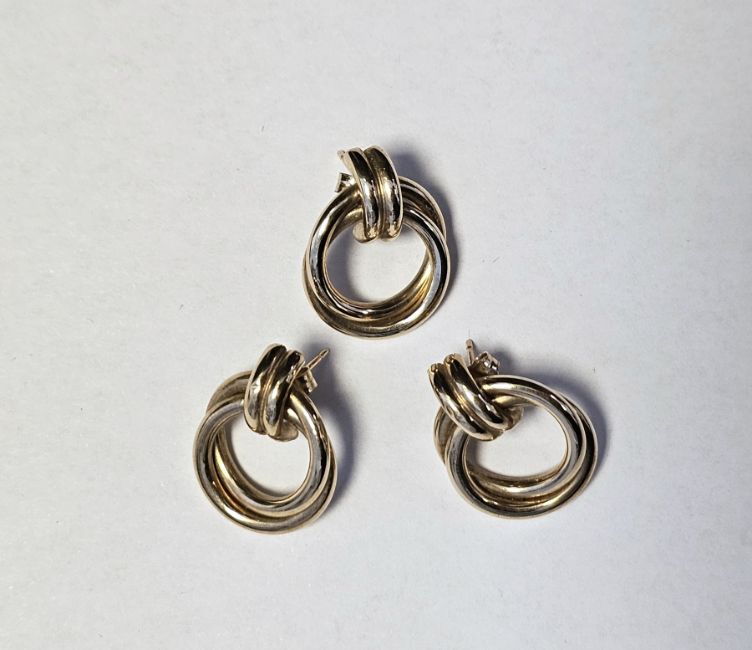 Pair of yellow metal drop earrings, each comprising double hoops, together with a matching earring all with butterfly fittings stamped 375, total weight 2.3 grams (3)