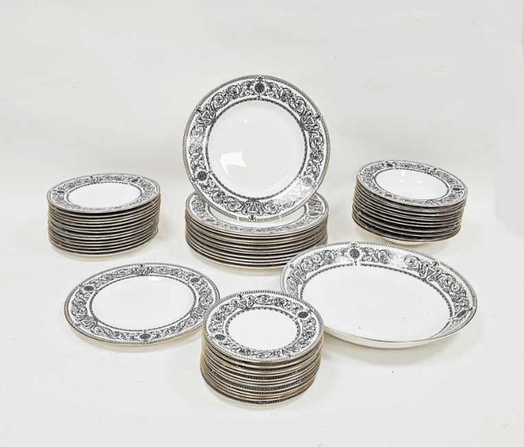 20th century Royal Worcester bone china Padua pattern part dinner service, printed black marks, printed with scrolling acanthus, roundels and neo-classical vases in black within stiff leaf borders and gilt lined rims, comprising a large circular shallow dish, 12 dinner plates, 12 pudding bowls, 14 small plates, 12 side plates and one luncheon plate