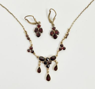 10k yellow gold and garnet link necklace, set with round, oval and drop pear-shaped garnets, together with a pair of 9ct yellow gold and garnet set drop earrings, total weight 7.8 grams