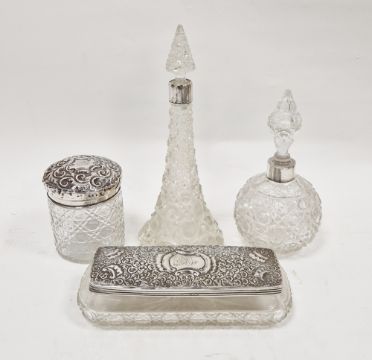 Victorian hobnail cut glass perfume bottle and stopper with silver collar, Chester 1899, Robert Pringle, 23cm high together with a bulbous hobnail cut glass perfume bottle with silver collar and matched stopper and two silver hallmarked lidded dressing jars (4)