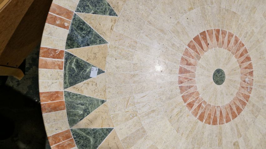 Modern circular conservatory table with marble and stone inlaid effect top, on a scrolling metal base, 74cm high x 106cm diameter Property of Dunkirk Manor, Theescombe, Stroud Condition Report Good overall condition, some light surface scratches and marks to top, accretions, general wear and tear.
