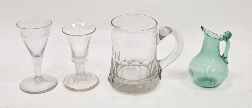 Collection of glassware comprising a firing glass, probably mid-18th century, with flared bell-shaped bowl above an airtwist stem, on spreading foot, 11.3cm high, a continental late 18th/early 19th century drinking glass, the conical bowl engraved with a border of flowers, on spreading foot, a green tinted wrythen-moulded carafe and a 19th century tankard with strap handle, lappet cut, 12.7cm high (4)
