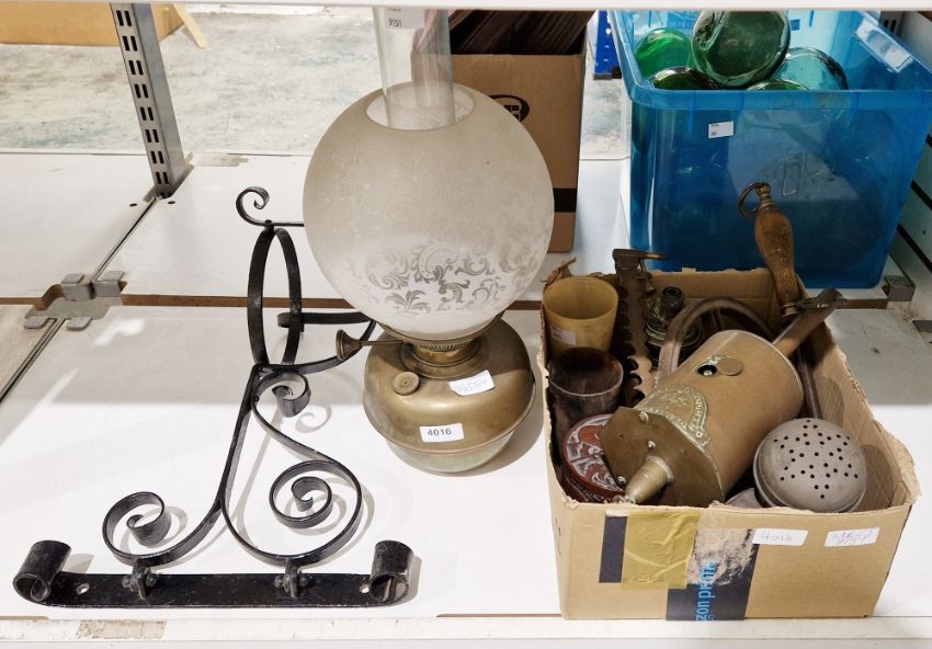 Antique John Linwood brass clockwork roasting spit jack together with late 19th / early 20th century brass wall mounted oil lamp on a wrought iron bracket with bulbous opaque etched glass shade and glass chimney, 45cm high, two horn beakers, copper warming pan and other metalware