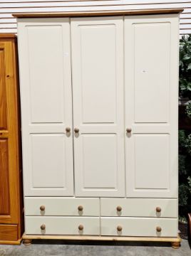 Modern cream-effect and pine triple wardrobe, the three cupboard doors opening to two hanging spaces over an arrangement of four drawers and raised on squat bun feet, 185cm high x 131cm wide x 57cm deep  Property of Dunkirk Manor, Theescombe, Stroud Condition Report