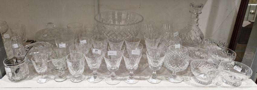 Large collection of 20th century cut table glass including a set of Stuart wine glasses cut with hobnail pattern, etched marks, a set of five hobnail cut brandy balloons, a Regency-style decanter and flat stopper, six low footed bowls and assorted drinking glasses, liqueur glasses, tumblers in sizes and a Stuart large cut glass footed bowl cut with hobnail pattern, 24cm diameter