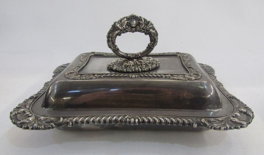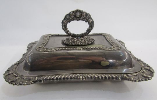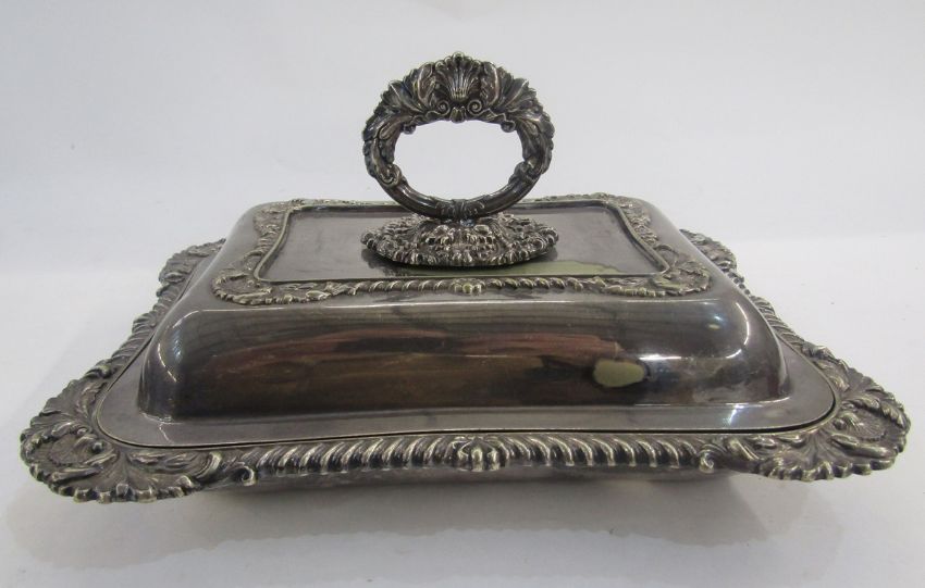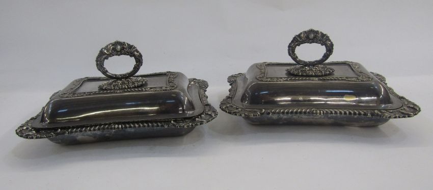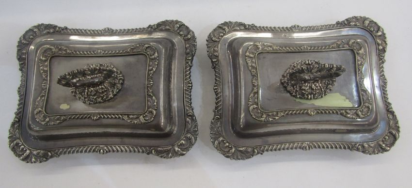 Pair of silver plated entree dishes, each rectangular, with ornate foliate bayonet handles, shell, foliate and gadrooned borders, 31cm long x 23cm wide