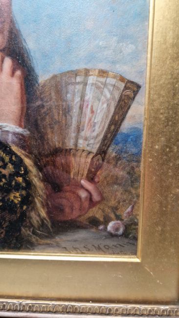 Joshua Hargrave Sams Mann (1826-1886)  Oil on board Portrait of Spanish lady in black veil holding a fan, signed J.H.S.Mann indistinctly dated lower right, within giltwood frame, 26.5cm x 21.5cm  Condition Report Accretions on inside of glass. Possible areas of overpainting under UV but could just be areas heightened with white and red. General wear and tear.